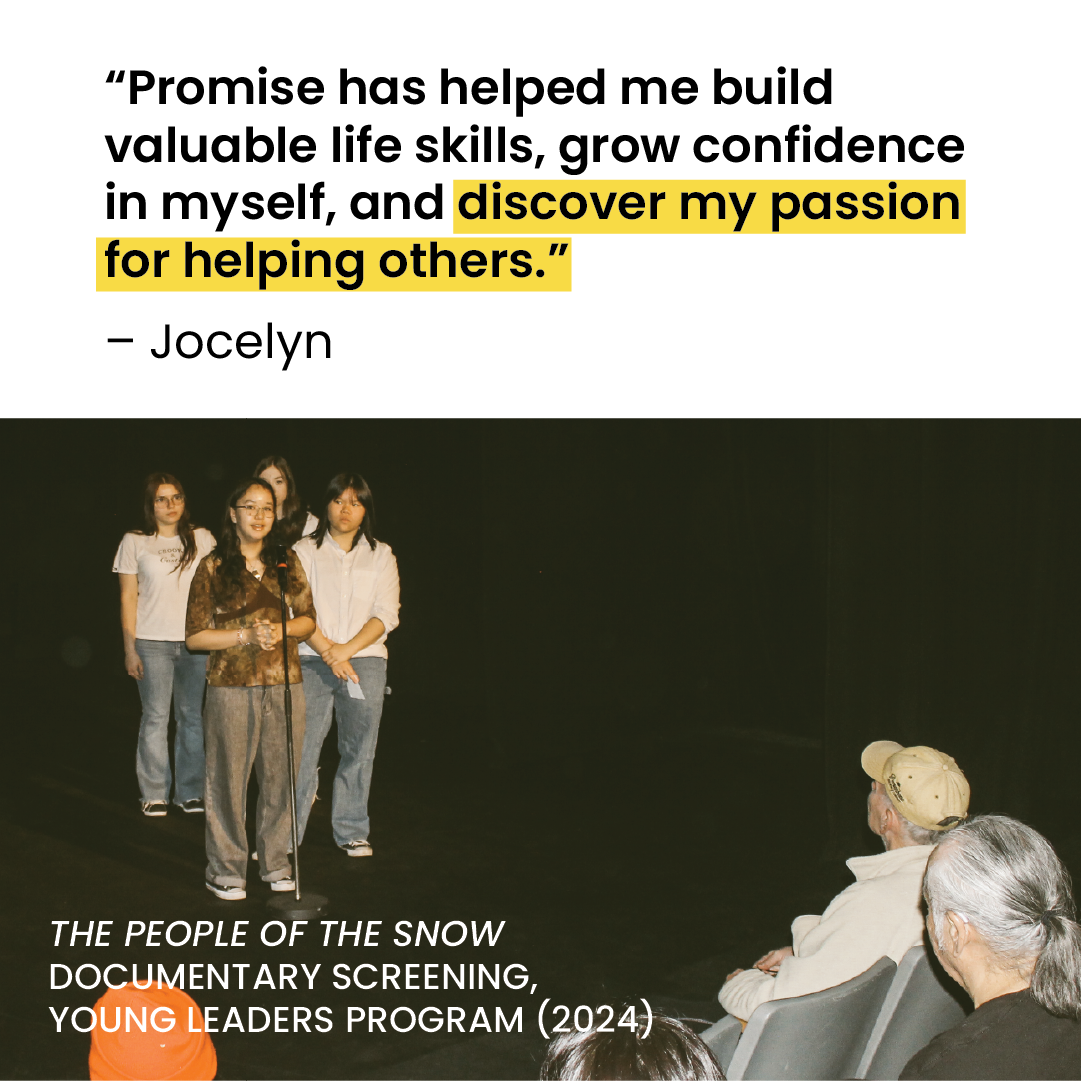 Over three years at Promise, these two girls were deeply involved here: they mentored younger kids in their community as Young Leaders, created and screened “The People of the Snow” (a documentary featuring perspectives from Jocelyn’s fellow members of Haisla Nation) as a powerful community impact project, and each completed a Trekkers outdoor experiential learning project. These two are beloved members of Promise’s community and have consistently modeled strong character, capability, and compassion.